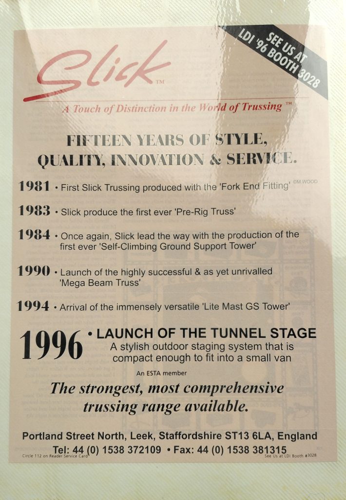 The story begins with Mike Wood, a skilled metalworker at Trader Horn Welding. Through a sequence of events, Wood and his workshop found themselves involved in the entertainment industry. This venture ultimately led to the formation of Slick Systems International Ltd, a company from which all modern pinned connectors for modular truss systems originate.