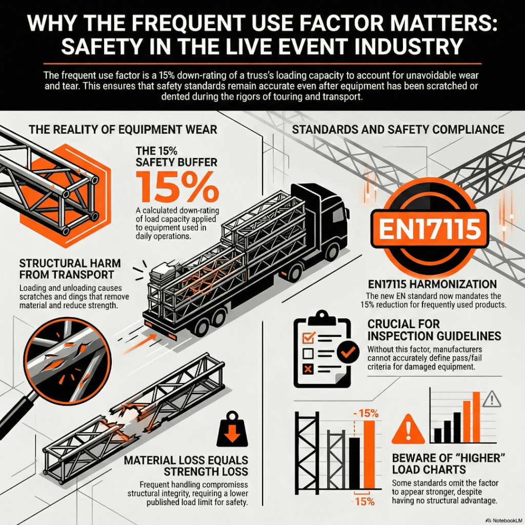 The frequent use factor is a down rating of the loading capacity that is applied to truss used in the entertainment industry for damage and general wear and tear resulting from its day to day use.